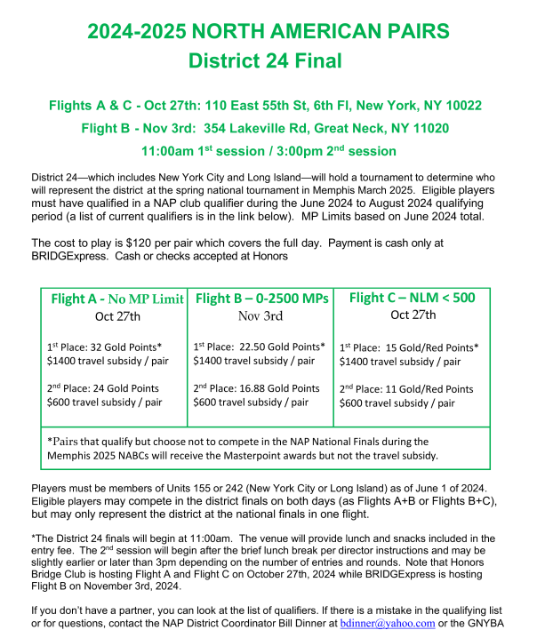 Our organization is run by a Board of Directors elected by our general membership. These volunteers, along with our club officials and thousands of bridge players in our area, have created an atmosphere in which friendly, competitive bridge is thriving on Long Island. At the same time and looking to the future, a devoted team of teacher volunteers have successfully introduced bridge to elementary and middle school students in our public schools in an ongoing effort to develop a new generation of bridge players. Whether as a player, a teacher, a Board member or tournament volunteer, the NSBA welcomes your participation. Please feel free to contact us through the links on this website if you have any questions, comments or concerns regarding bridge on Long Island.
